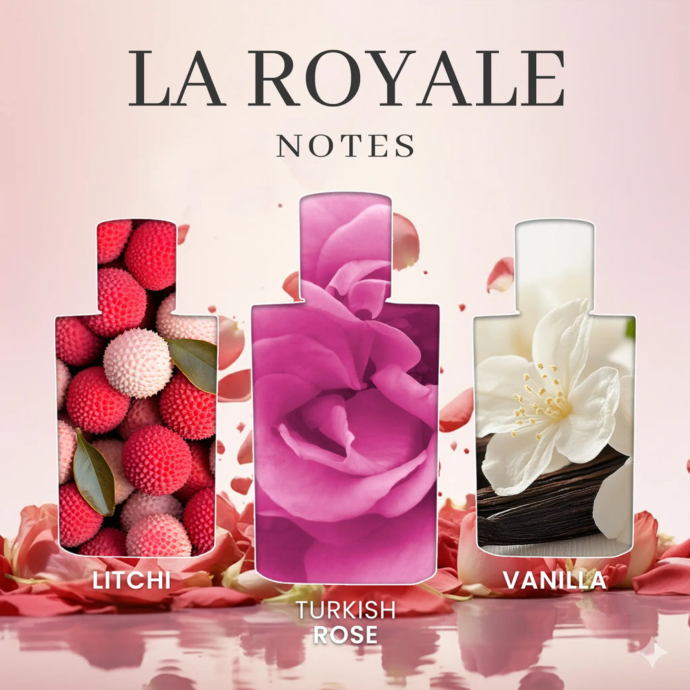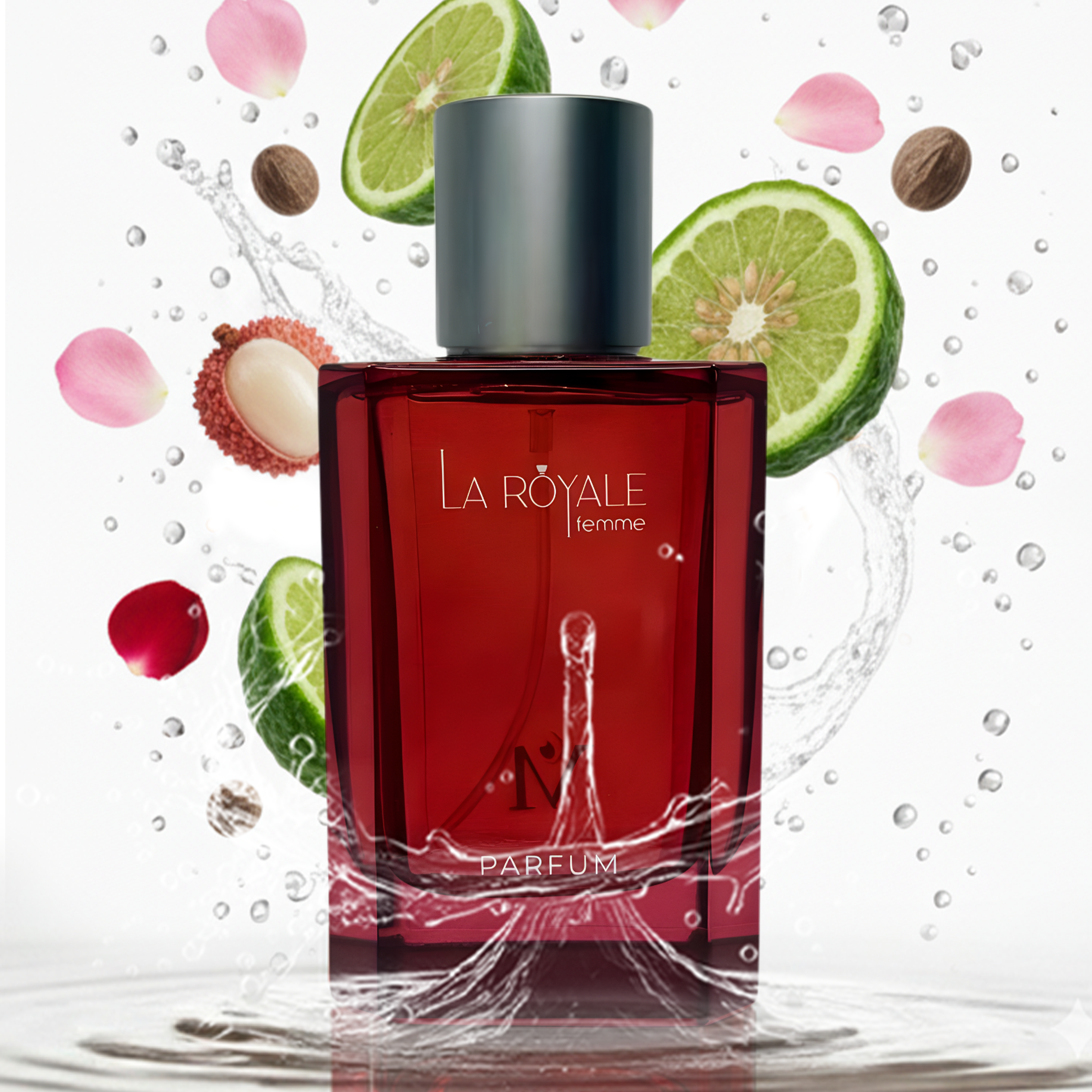 An elegant fusion of sensual florals and soft woods. La Royale Femme opens with the tart sweetness of litchi and rhubarb, brightened by bergamot and the warmth of nutmeg. At its heart, Turkish rose and peony bloom over a whisper of musk and petalia, softened by vanilla. As it settles, cashmeran, cedar, Haitian vetiver, and a hint of incense linger—smooth, velvety, and quietly powerful.